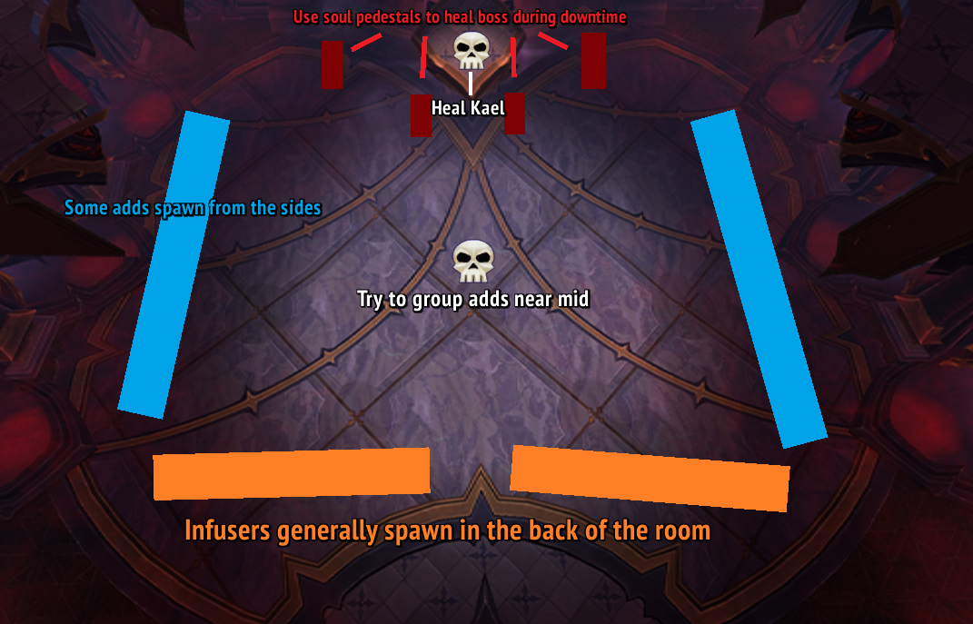 - To heal Kael'thas, healers can spot heal him and the Essence Fonts that drop on the floor. Dps and tanks can click the Soul Pedestals near Kael to drain their hp to heal him.